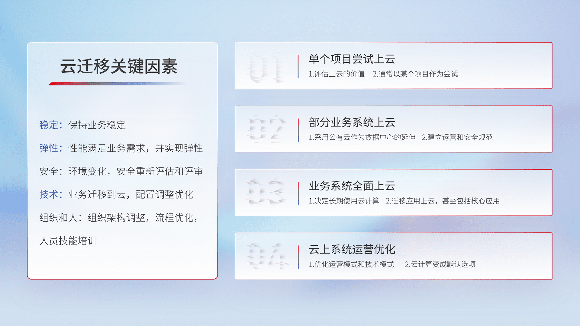 结合实际业务,,,,从规划设计、、、云平台选型、、、云原生改造、、、数据迁移、、、集成交付,,迁移全过程为客户识别最佳上云路径,,做好风险识别管理,,设计网络架构、、、、身份权限、、、、安全审计合规、、操作审计、、、日志审计、、、监控告警策略、、多站点容灾设计等,,,对云上基础设施进行整体规划,,,,提升IT治理水平,,,,以满足弹性、、、高可用、、、高性能的需求。。。。