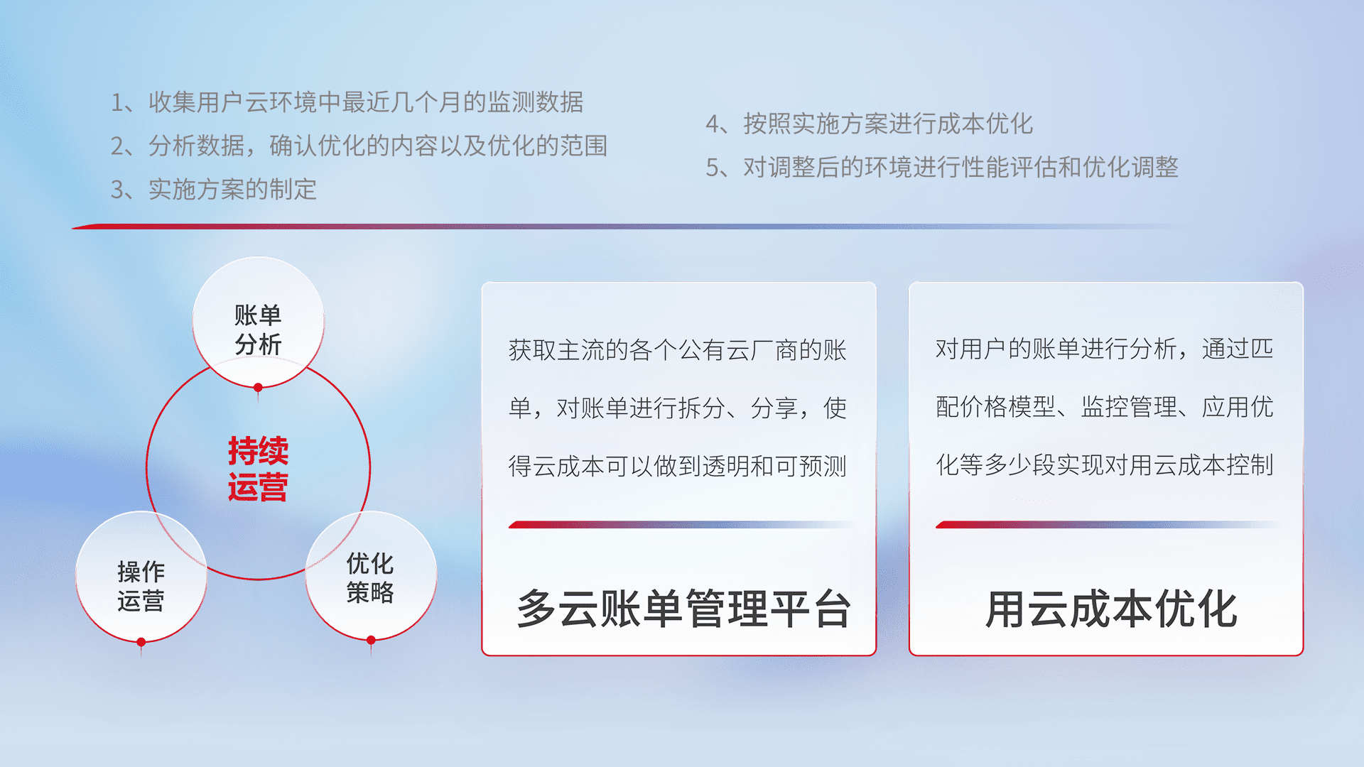 通过多云纳管,,以统一的资源数据模型把客户的云资源进行抽象和封装,,进而实现对多云资源的统一操作,,,,保障云资源管理的可靠性、、稳定性与可用性。。。量身定制化运维内容,,,,配置、、开发运维、、、、补丁管理、、、备份、、、、监控、、、认证和访问管理、、、审计和日常巡检等,,,,保障在用云过程中的可靠度,,,,稳定度以及高可用率。。。